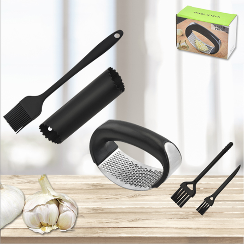 5 पीसी स्टेनलेस स्टील लहसुन प्रेस, एल-आर्क आकार डिजाइन लहसुन के साथ सिलिकॉन ट्यूब लहसुन क्रशर और साफ